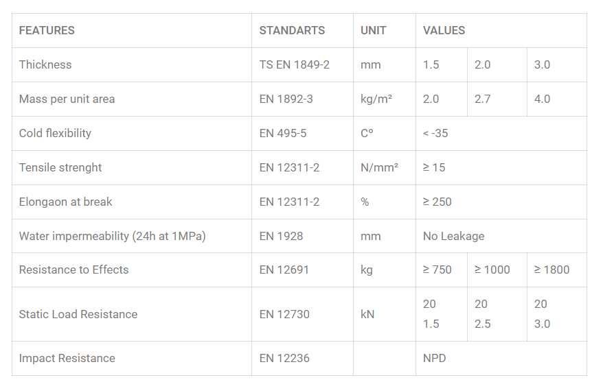 | Thickness | TS EN 1849-2 | mm | 1.5 | 2.0 | 3.0 |